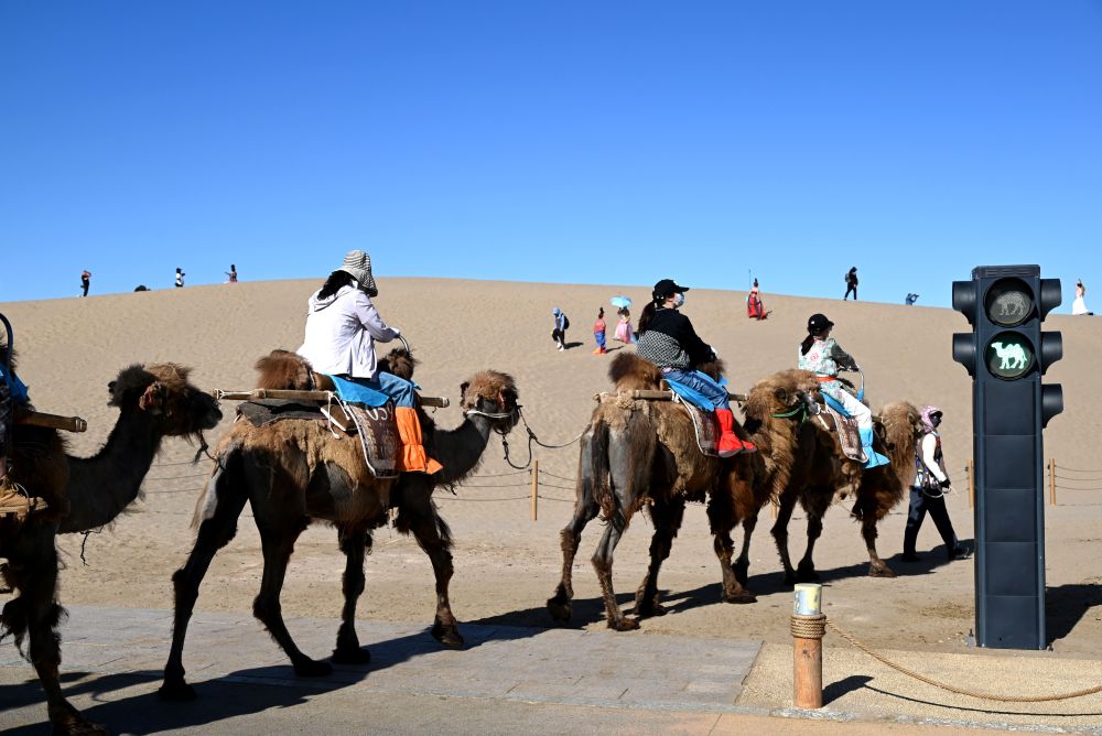 5月24日,敦煌市鳴沙山月牙泉景區(qū)的交通信號燈“綠駱駝燈”亮起時,農(nóng)戶牽著駱駝有序通過。敦煌市鳴沙山月牙泉景區(qū)設(shè)置具有駱駝元素的交通信號燈,保障了景區(qū)交通安全順暢。新華社發(fā)(張曉亮攝)