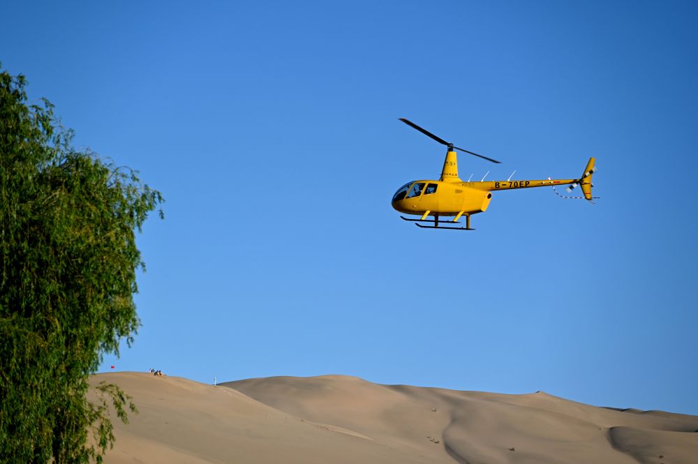 5月24日,在敦煌市鳴沙山月牙泉景區(qū),游客乘坐直升機從空中欣賞大漠風(fēng)光。新華社發(fā)(張曉亮攝)
