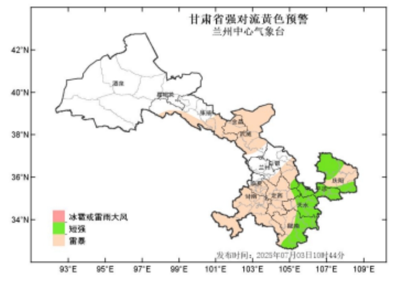 蘭州中心氣象臺(tái)2025年7月3日10時(shí)44分繼續(xù)發(fā)布強(qiáng)對(duì)流黃色預(yù)警:預(yù)計(jì)未來(lái)24小時(shí),張掖、金昌、武威、蘭州、白銀、甘南、臨夏、定西、隴南、天水、平?jīng)?、慶陽(yáng)等州市有雷暴,其中隴南、天水、平?jīng)?、慶陽(yáng)等市部分地方及白銀、定西兩市局部地方有短時(shí)強(qiáng)降水,最大小時(shí)雨強(qiáng)20-60mm;隴南、天水、平?jīng)?、慶陽(yáng)等市強(qiáng)降水在未來(lái)24小時(shí)內(nèi)多發(fā),白銀、定西主要強(qiáng)降水時(shí)段在4日2-8時(shí)。請(qǐng)注意防范!