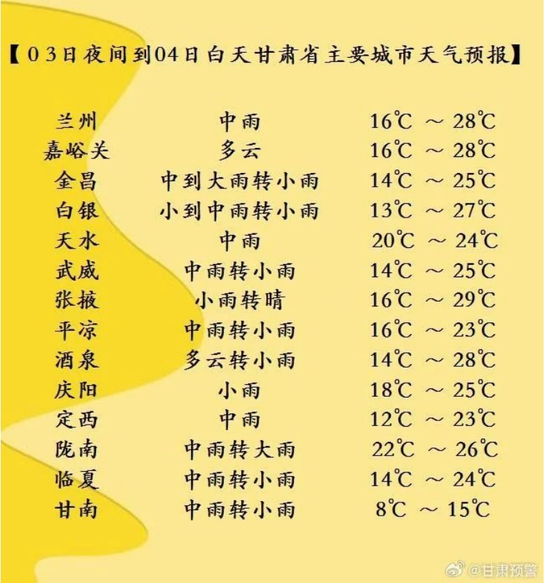 今天夜間到明天白天(7月3日20時(shí)-7月4日20時(shí)),酒泉、嘉峪關(guān)、張掖三市多云間陰,局部地方有小雨,祁連山區(qū)有中到大雨;省內(nèi)其余地方陰有小到中雨,其中隴南、天水、平?jīng)?、慶陽(yáng)等市局部地方及定西、甘南兩市州東部、白銀市南部有暴雨。