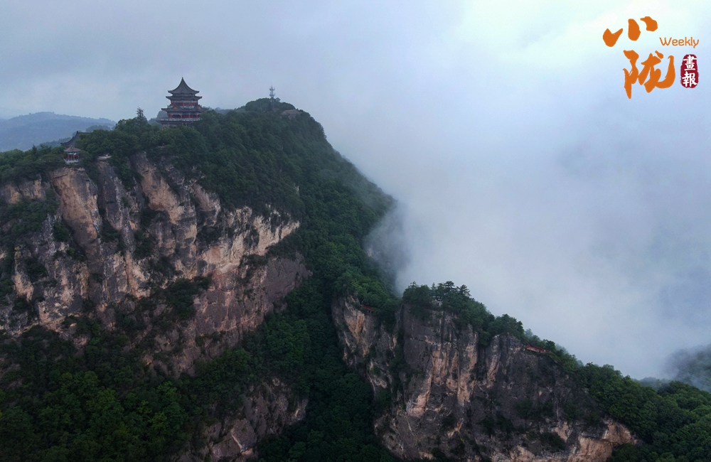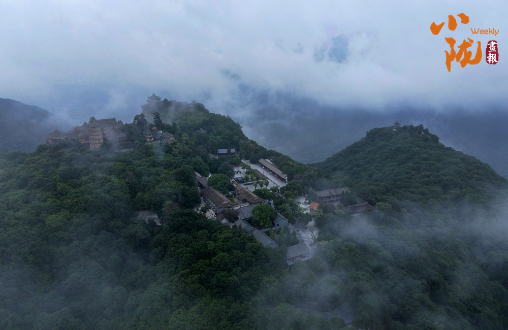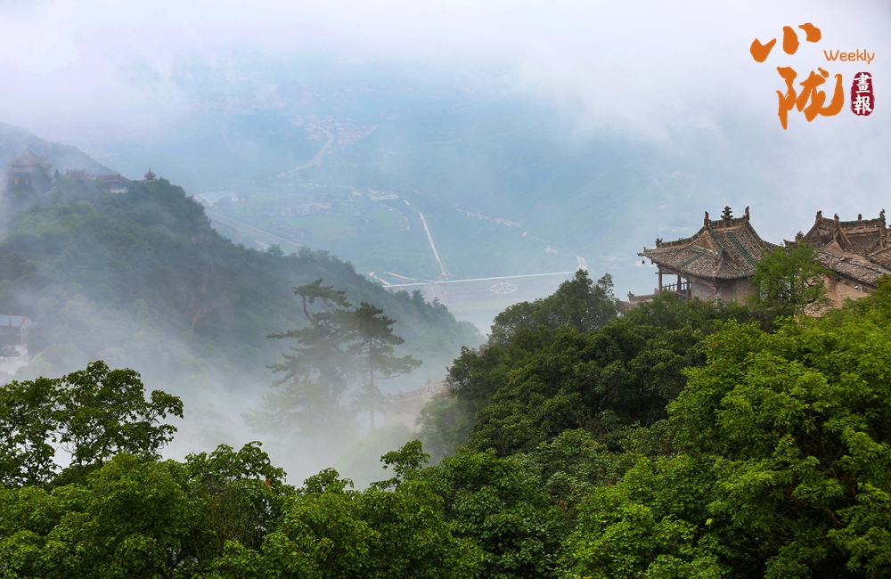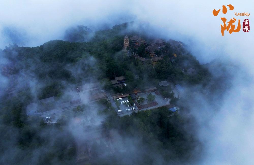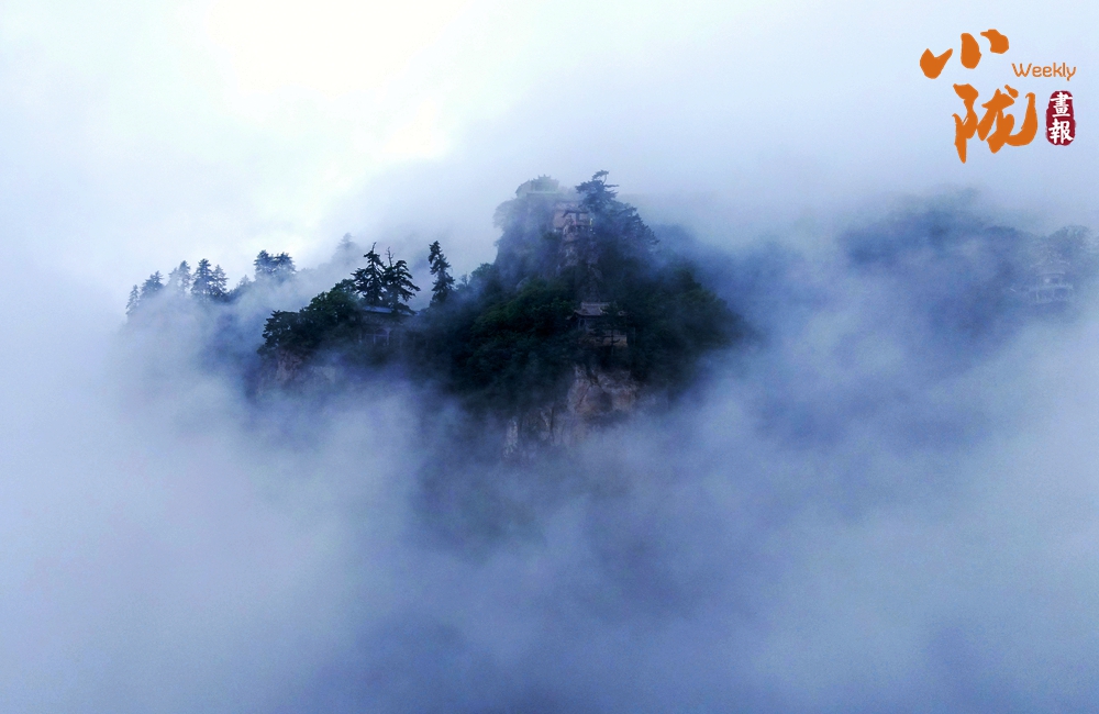 云霧繚繞,山水與寺廟隱現(xiàn),營造出神秘且令人向往的視覺效果。站在半山腰,背靠懸崖,深邃不可見底,不禁生出“山登絕頂我為峰”的豪情。然而,世間萬物,瞬息萬變,是否成為峰巔之巔又何妨?