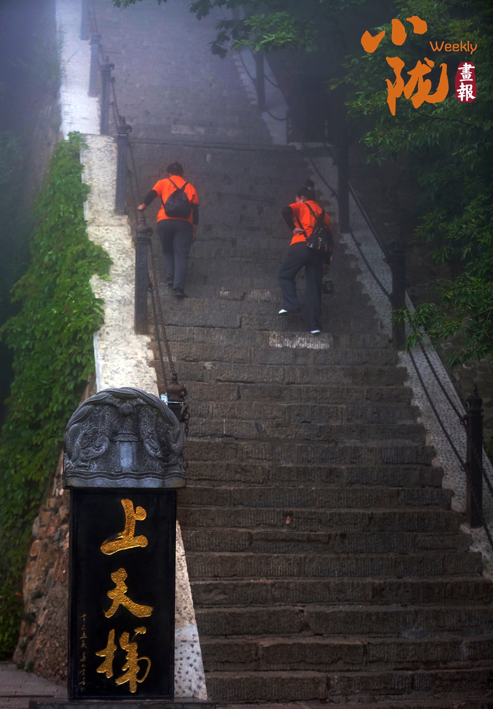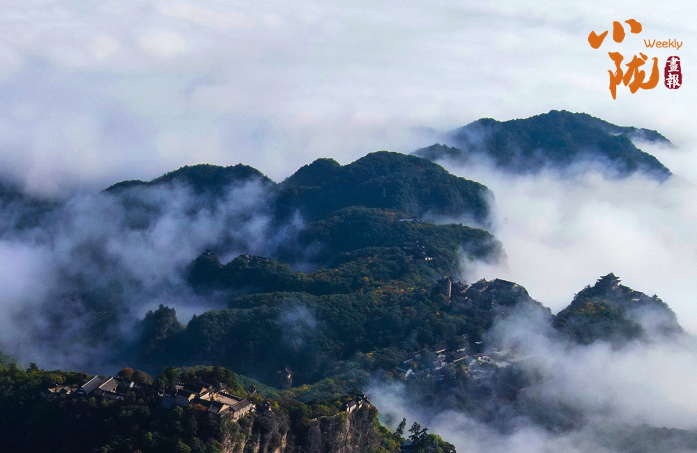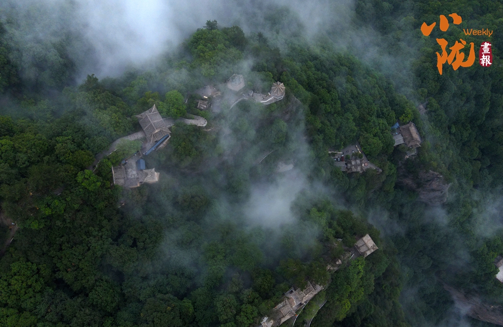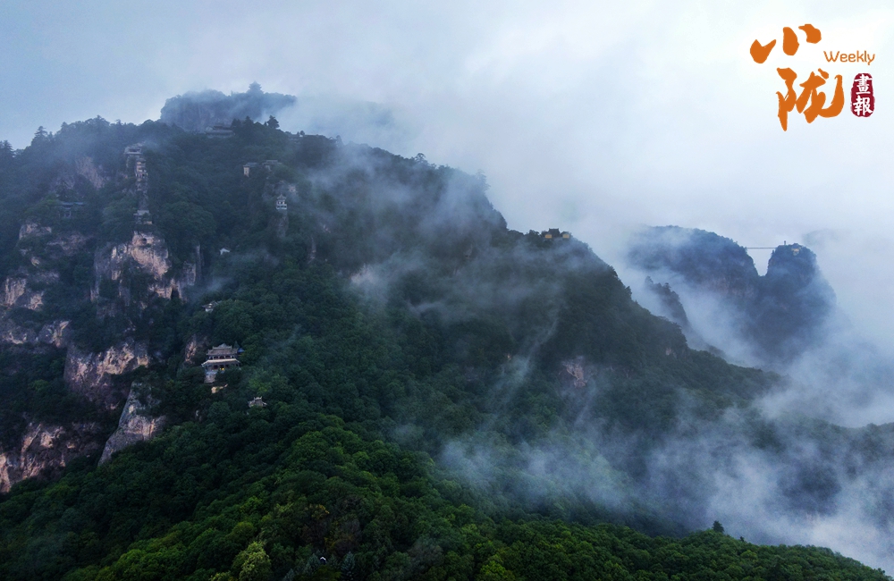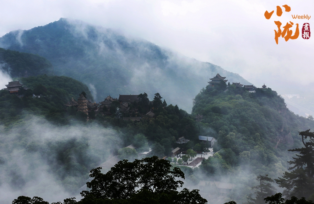云霧繚繞,山水與寺廟隱現(xiàn),營造出神秘且令人向往的視覺效果。站在半山腰,背靠懸崖,深邃不可見底,不禁生出“山登絕頂我為峰”的豪情。然而,世間萬物,瞬息萬變,是否成為峰巔之巔又何妨?