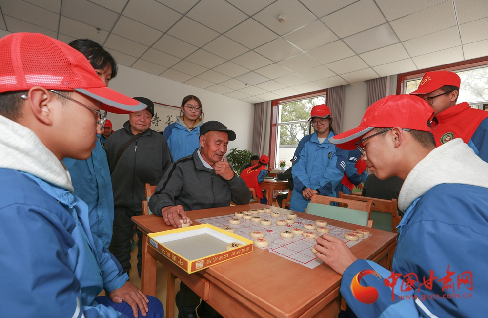 學(xué)生志愿者與老人一起下象棋