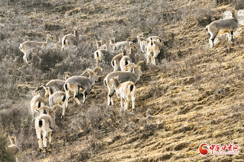 畫(huà)面中,頭羊領(lǐng)隊(duì),群羊于峭壁山坡間或奔或走、尋覓食物。巖羊灰褐皮毛與巖壁融為一體,盡顯和諧之美。其體型中等,形態(tài)介于野山羊與野綿羊之間,作為青藏高原常見(jiàn)野生動(dòng)物,常年棲息于海拔2000米至6000米的高山裸巖地帶,屬?lài)?guó)家二級(jí)重點(diǎn)保護(hù)野生動(dòng)物。巖羊堪稱(chēng)“巖壁上的精靈”,擅長(zhǎng)懸崖穿梭,警惕性極高,難以靠近。其蹄堅(jiān)硬且具防滑紋理,能在近乎垂直巖壁穩(wěn)穩(wěn)立足、敏捷跳躍。
