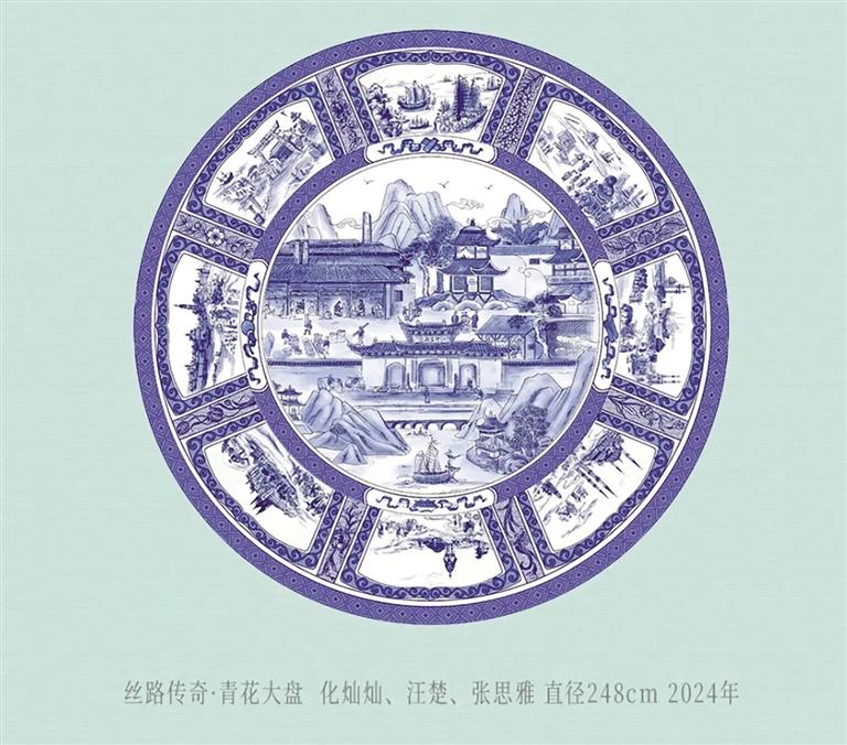 值得關(guān)注的是,展品中既有莫高窟第328窟復(fù)制彩塑這樣的經(jīng)典再現(xiàn),也有直徑達248厘米的“絲路傳奇·青花大盤”,呈現(xiàn)出多元文明共生的歷史圖景。瓷器作品是江西瓷藝大師歷時多年、多次赴敦煌采風(fēng)創(chuàng)作的結(jié)晶,通過高溫顏色釉的窯變特性,將敦煌壁畫的斑駁肌理與礦物顏料的神秘色彩凝固定格,在釉色流淌間實現(xiàn)古典美學(xué)與現(xiàn)代工藝的完美融合。