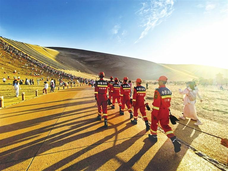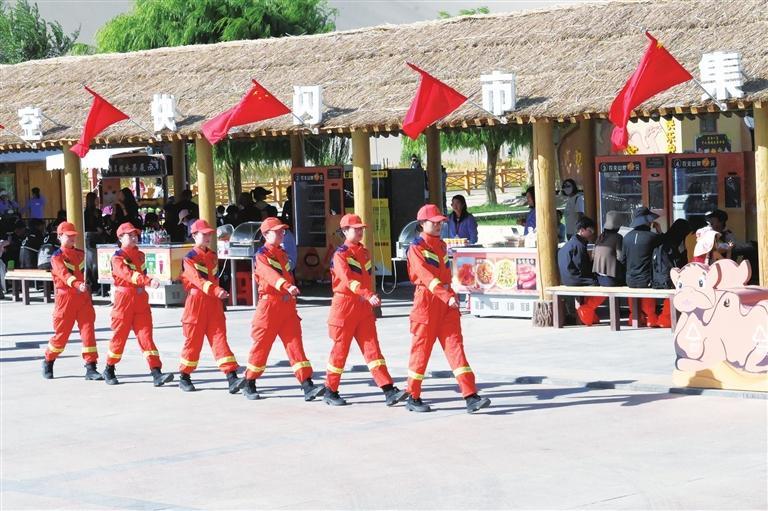 溫情關(guān)愛救助游客。鳴沙山“萬人大合唱”作為敦煌近年來的熱門文旅項(xiàng)目,暑期每日吸引數(shù)萬游客前來打卡,人群密集,安全隱患不容忽視。根據(jù)敦煌市委、市政府的安排,大隊(duì)每天派出消防車輛和指戰(zhàn)員現(xiàn)場(chǎng)執(zhí)勤,并根據(jù)實(shí)際需要在月牙泉和鳴沙山設(shè)置了兩處群眾服務(wù)救助執(zhí)勤點(diǎn),由20人組成“九色鹿”女子消防服務(wù)隊(duì),提供傷病緊急救助、失物尋找、人員疏散引導(dǎo)、安全知識(shí)宣傳教育等服務(wù)。僅今年,就幫助找回走失兒童21名、手機(jī)和錢包60余件,救助中暑等突發(fā)疾病游客7人。“九色鹿”女子消防服務(wù)隊(duì)的隊(duì)員們既懂外語,又了解敦煌文化,還熟悉消防安全知識(shí),掌握一定的醫(yī)療救助和應(yīng)急救援技能,她們的貼心服務(wù)受到了游客的好評(píng),成為敦煌一道亮麗的風(fēng)景線。