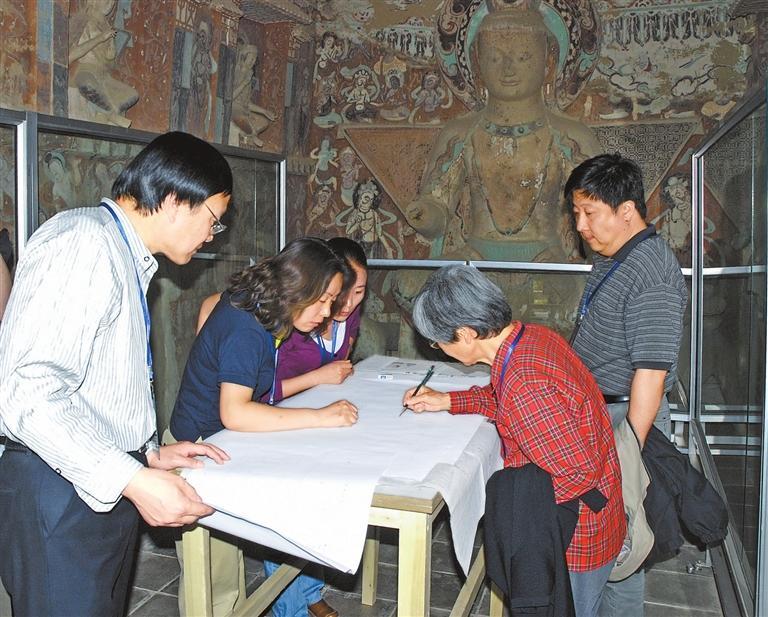 2007年,為石窟考古報(bào)告評議手工測繪圖。 本版圖片除署名外均由敦煌研究院提供