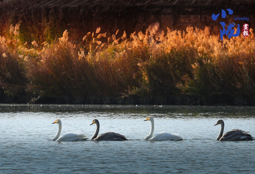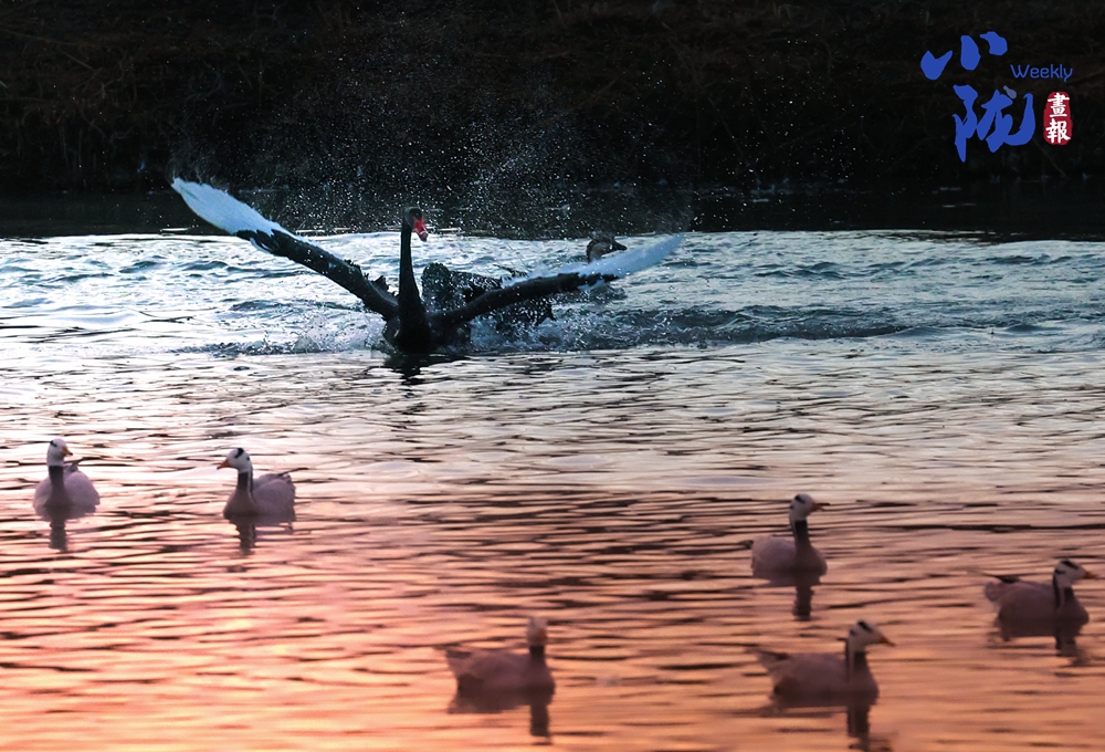 這里聚集了黑鸛、白鷺、鴛鴦、天鵝、赤麻鴨、灰雁等多種水鳥,它們在黃昏里愜意地游弋,或扎進(jìn)水里捕魚,或相互追逐戲水的畫面,既震撼又溫柔,成為攝影愛好者和游人爭相追逐的“冬日奇景”。