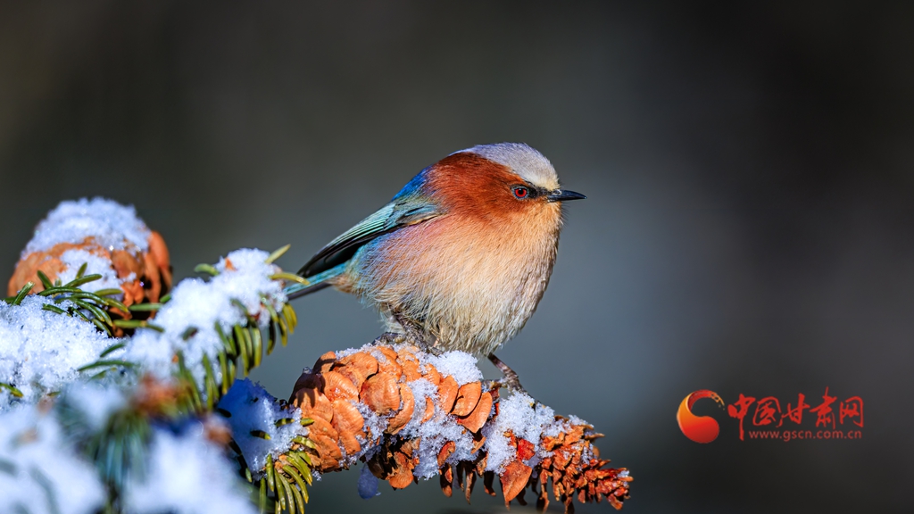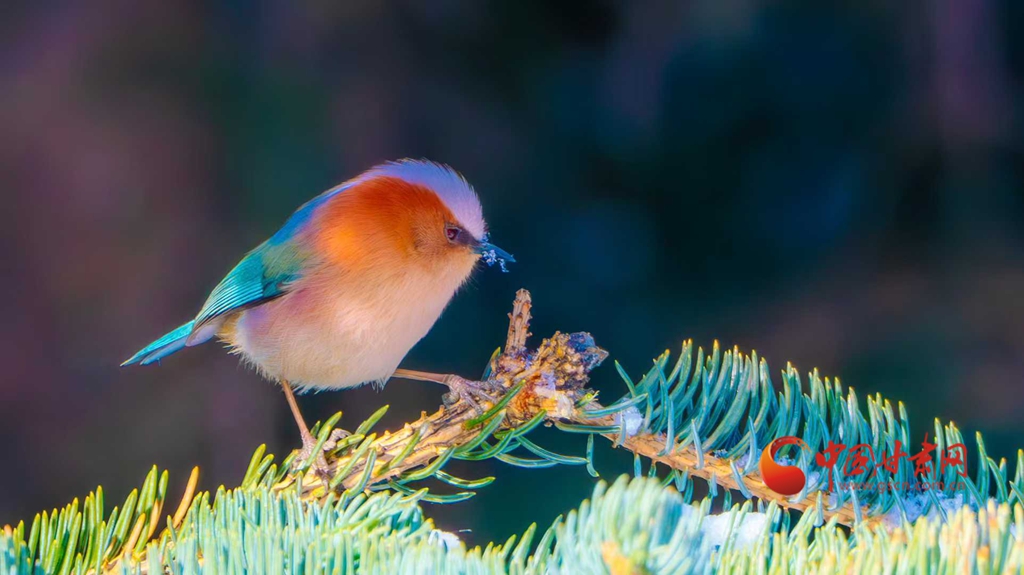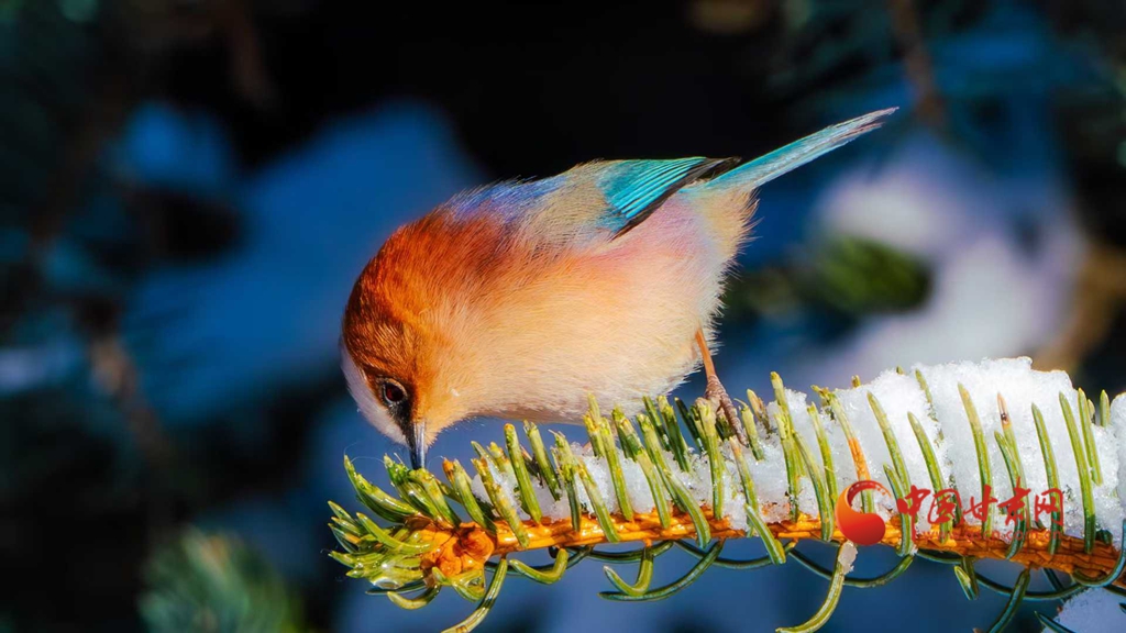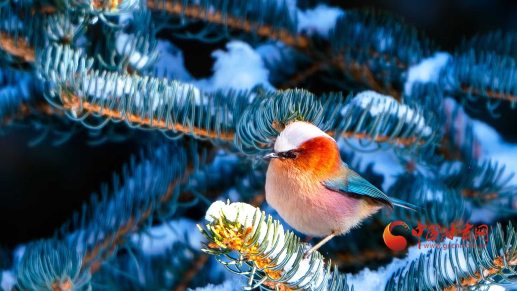 這群被譽(yù)為“祁連山精靈”的小鳥,頭頂雪白羽冠蓬松如絨,仿佛戴上了一頂天然的小絨帽,棕紅面頰溫潤(rùn)似玉,在陽(yáng)光下泛著柔和的光澤,藍(lán)綠背羽如同上好的寶石,在雪色映襯下泛著金屬般的質(zhì)感。淡粉與橙白相間的腹羽柔和雅致,層次分明,在純白背景的映襯下,形成強(qiáng)烈而和諧的視覺碰撞,它們或亭亭立于覆雪松枝,或靈巧穿梭于松針間隙,更有靈動(dòng)的個(gè)體俯身探喙,啄取松針縫隙里的昆蟲,一聲輕脆的啄擊,劃破林間的清寂,卻更顯山野幽靜,羽翼輕振間,將“雪中覓食”的鮮活圖景永久定格。