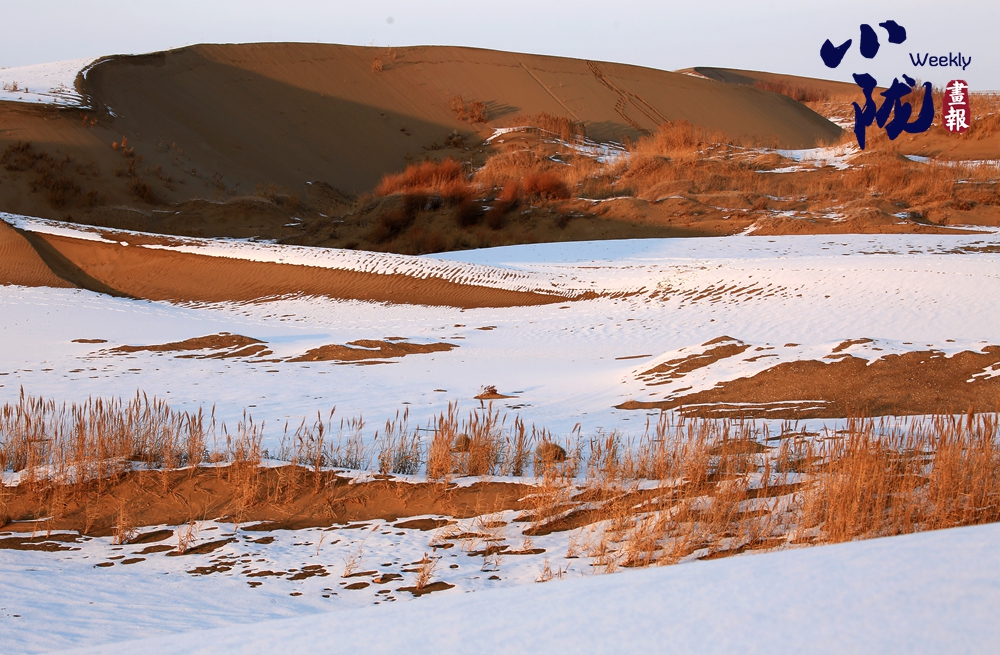 白雪覆蓋著金黃沙丘,而枯黃的蘆葦仍倔強生長于沙地之間。這不僅是色彩的疊映,更構成了一幅堅韌的畫卷:冷與暖、靜與動,在遼闊的天地間,交織成一篇關于守望與重生的故事。
