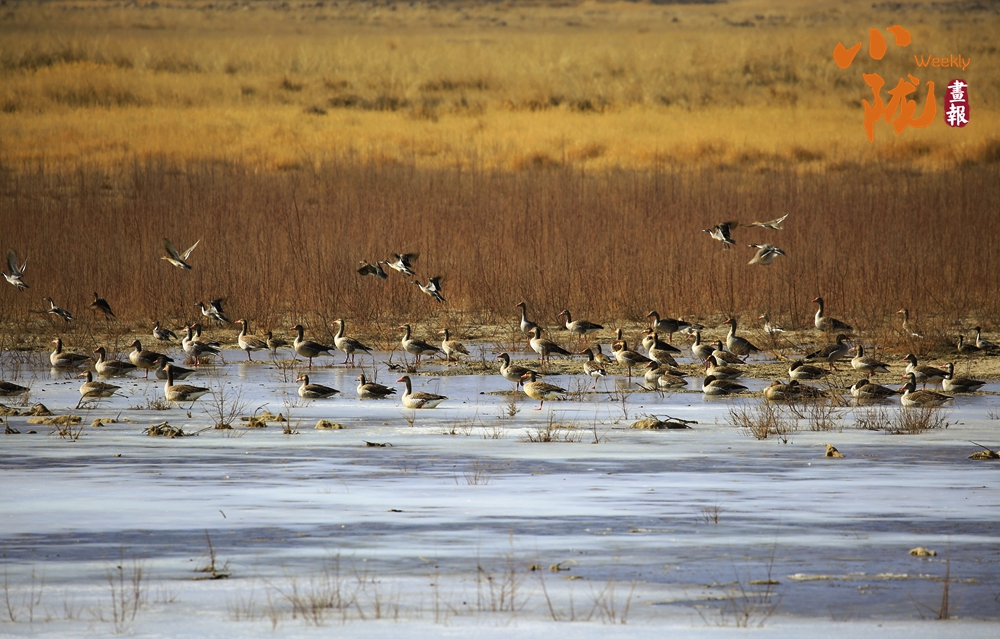 冬日濕地,鳥類或靜立冰面,或翩然飛越金黃蘆葦。每年候鳥遷飛之季,赤麻鴨等國家重點保護鳥類在此棲身,鳥鳴與葦浪聲交織回蕩,宛如自然寫就的生態(tài)詩篇。