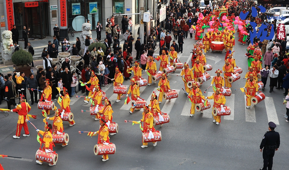太平鼓隊(duì)的指揮者豹頭環(huán)眼,胸前“帥”字披紅,手中兩米長(zhǎng)的令旗迎風(fēng)一展——百十面太平鼓瞬間炸響如雷。只見他騰挪跳躍,旗尖所指,鼓點(diǎn)隨之起伏,時(shí)而如萬(wàn)馬奔騰,時(shí)而似春雨潤(rùn)物。