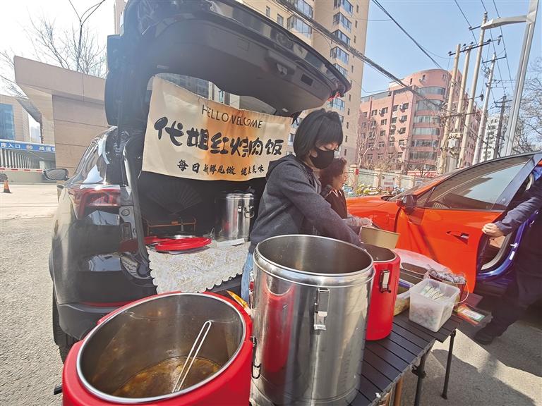 上午11時(shí)20分,甘南路民族飯店門(mén)口的人行道上,一輛簡(jiǎn)易流動(dòng)餐車(chē)準(zhǔn)時(shí)支起攤位。不銹鋼餐盆里,色澤鮮亮的炒肉片蓋飯熱氣升騰,濃郁香氣順著風(fēng)飄向周邊寫(xiě)字樓,短短幾分鐘,攤位前就排起了七八人的小長(zhǎng)隊(duì)。“老板,一份炒肉片蓋飯,多放青椒和咸菜!”“我要兩份,打包帶走!”熟練打飯、快速裝盒、掃碼收款,一氣呵成,不到20分鐘,桶里的米飯就下去了小半桶。