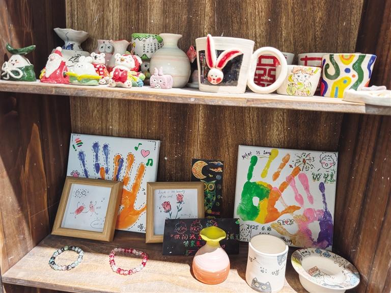 貨架上,各類手工成品整齊擺放:色彩豐富的拼豆掛件、簡(jiǎn)約精致的銀戒指、溫潤(rùn)質(zhì)樸的陶土杯、造型可愛(ài)的石膏玩偶,每一件都帶著手工獨(dú)有的溫度。