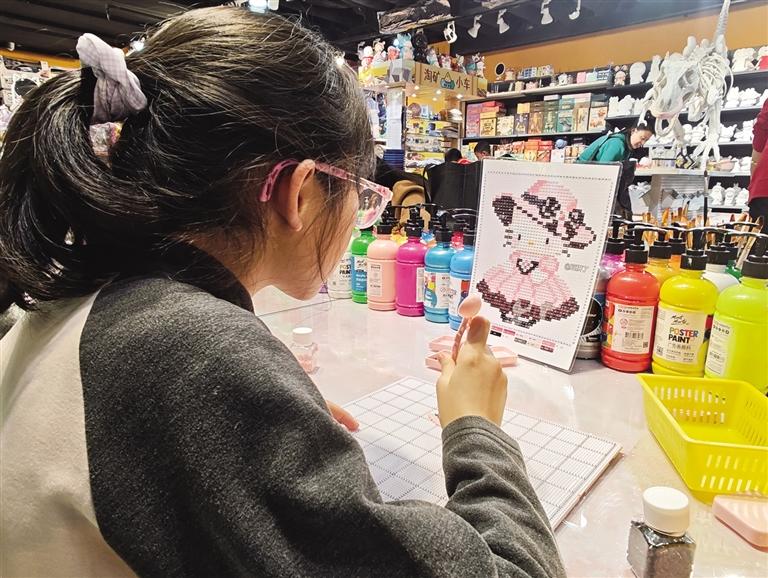 “我們主要做拼豆、銀飾DIY和陶藝,也有石膏彩繪、串珠、奶油膠這些項(xiàng)目,基本上當(dāng)下流行的手工都能體驗(yàn)到。”店內(nèi)工作人員告訴記者,一站式、多樣化的體驗(yàn),更符合現(xiàn)在消費(fèi)者的需求,不用跑多家店,就能玩遍多種玩法。