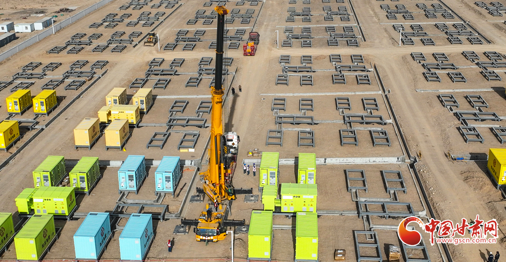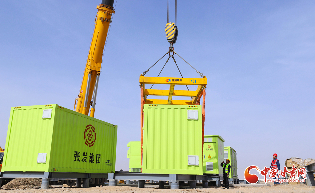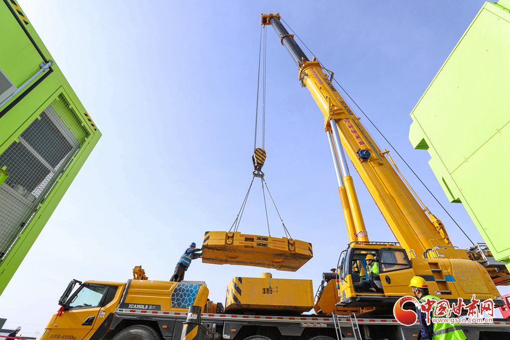 3月19日,張掖市山丹縣東樂灘上,工程建設(shè)者們正在進行儲能電站項目電池倉吊裝前的準備。