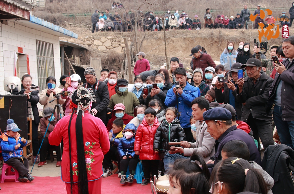 臺前演員投入表演,臺下不少村民舉著手機(jī)記錄這熱鬧場景。古樸的民居、山坡上攢動的人頭,伴著戲曲的唱腔,滿是傳統(tǒng)民俗活動的鮮活勁兒,盡顯民間藝術(shù)的感染力。