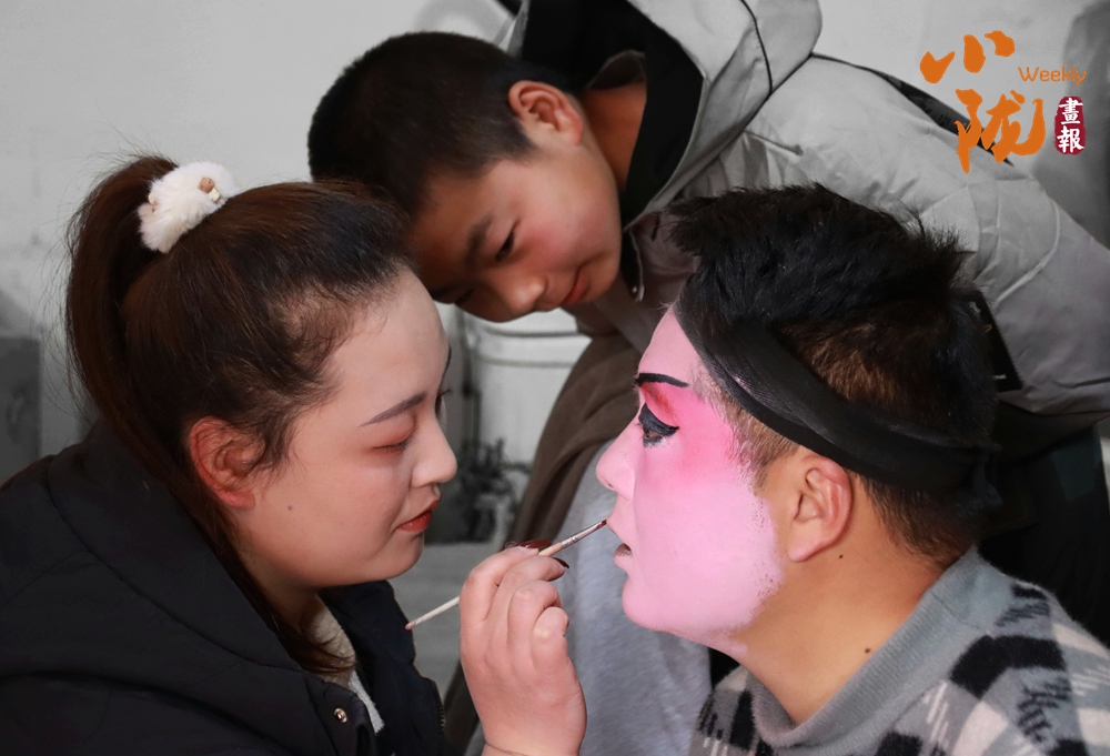 貼著紅春聯(lián)的屋門口,一位畫著戲曲臉譜的演員正對著手機(jī)調(diào)整妝容。這充滿鄉(xiāng)土氣息的戲曲準(zhǔn)備場景,滿是民間年俗里熱鬧又質(zhì)樸的煙火氣,也藏著傳統(tǒng)藝術(shù)在鄉(xiāng)土間的鮮活傳承。