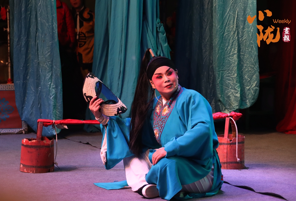 舞臺的藍(lán)幕前,一位演員正以跪坐的姿態(tài)投入表演,身著繡著精致紋樣的青藍(lán)色戲服,手持折扇,眉眼間滿是戲韻。臺側(cè)的紅色水桶、幕后的隱約人影,讓這充滿程式化的舞臺瞬間多了幾分鄉(xiāng)土演出的真實(shí)感。
