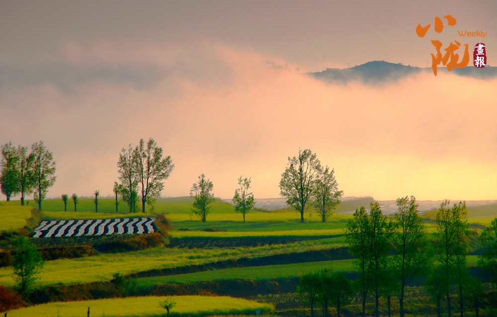 晨霧為華亭的春景蒙上柔紗,遠(yuǎn)山在霞光里若隱若現(xiàn)。層層梯田鋪展著嫩綠與明黃,田壟間覆著的條紋地膜泛著細(xì)光,疏朗的樹木錯落點綴,一派朦朧又鮮活的春野意趣。