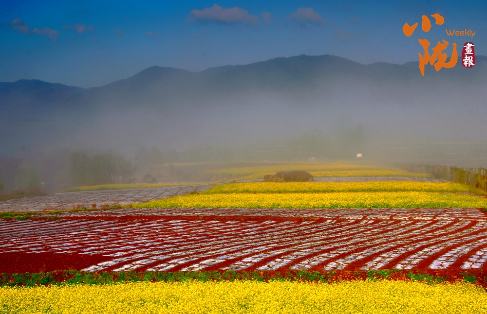晨霧漫過山巒,梯田鋪展成彩色織錦,黃花似金浪翻涌,紅花如霞錦鋪陳,遠(yuǎn)山含黛,天地間滿是春日的鮮活與詩意。